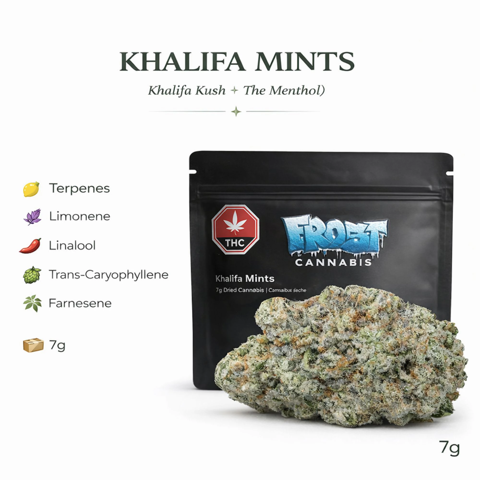 TERPS - 2.97% A cross of Khalifa Kush x The Menthol with extreme bag appeal completely frosted out with round rock hard buds. A potent Kush aroma with a bright mix of min, andthe flavour matches the smell making this an absolute pleasure to consume. Potency is very strong in this cultivar a current legacy genetic in Ontario admired for its potency, flavour and bag appeal.