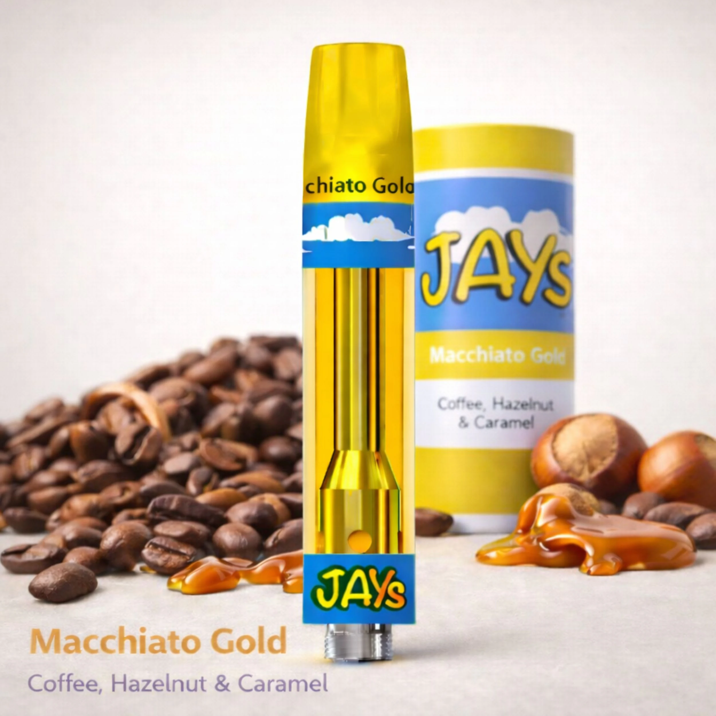 Jays presents playful and potent products full of flavour in convenient formats. Our high potency THC distillate is expertly formulated with the sweet flavours of Macchiato Gold with coffee and hazelnut. Captured in a universal 510 cart for convenient pulls wherever you go.
