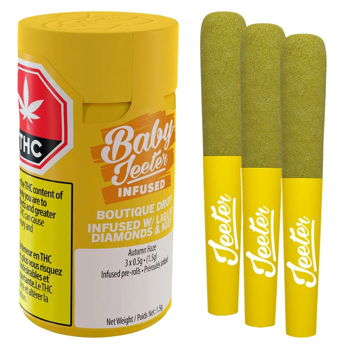 A limited edition pack of Liquid Diamond Infused Baby Jeeter pre-rolls. Every few weeks, we switch it up with new strains, delivering high THC and fresh flavours. Each pre-roll is made with quality buds, infused with liquid diamonds and rolled in our in-house kief for extra potency. More diamonds, more THC and more flavour. Always a consistent burn. And with each drop, youre getting something fresh, high quality and limited edition.