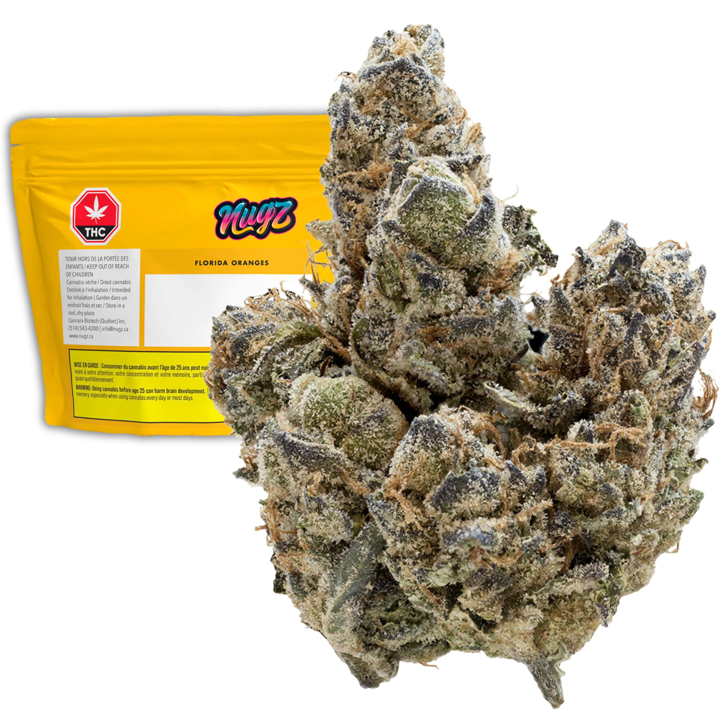 TERPS - 2.4% Nugz Florida Oranges is a citrus fuelled flower that delivers exactly what you’d expect from its name: loud orange zest with a punch of gas on the backend. This indica leaning hybrid comes stacked with sticky resin-rich buds bursting with a tangy and sweet terpene profile led by limonene, caryophyllene and myrcene. Hand trimmed, hang dried and grown in our indoor facility, Florida Oranges brings big flavour and high potency for consumers who want more out of their bag. Packed fresh in a resealable mylar pouch to lock in that Nugz quality.