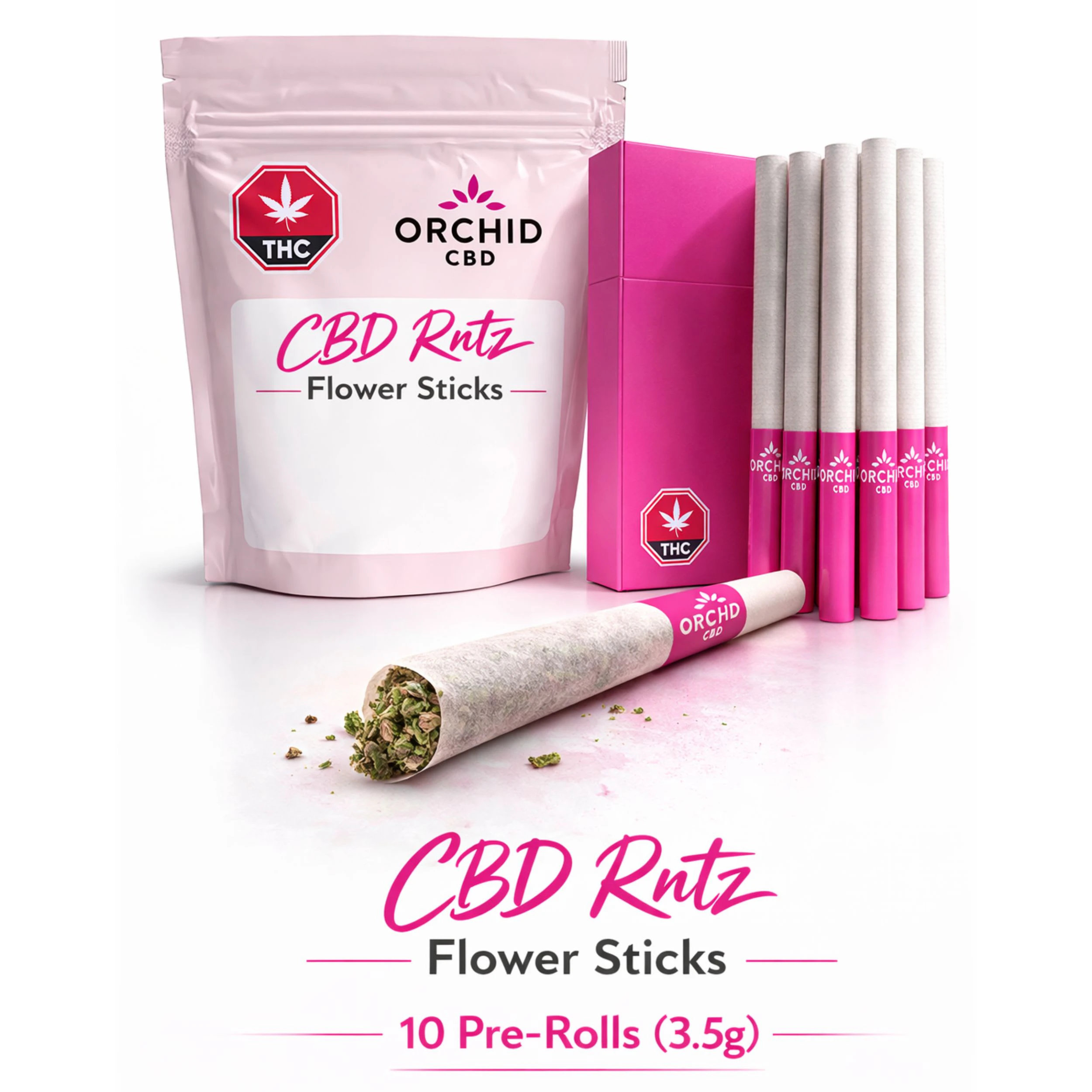 TERPS 2.2% Orchid CBD Rntz Flower Sticks are whole flower, ground to perfection, then rolled up in straight-cut pre-rolls that offer a sweet Rntz flavour.