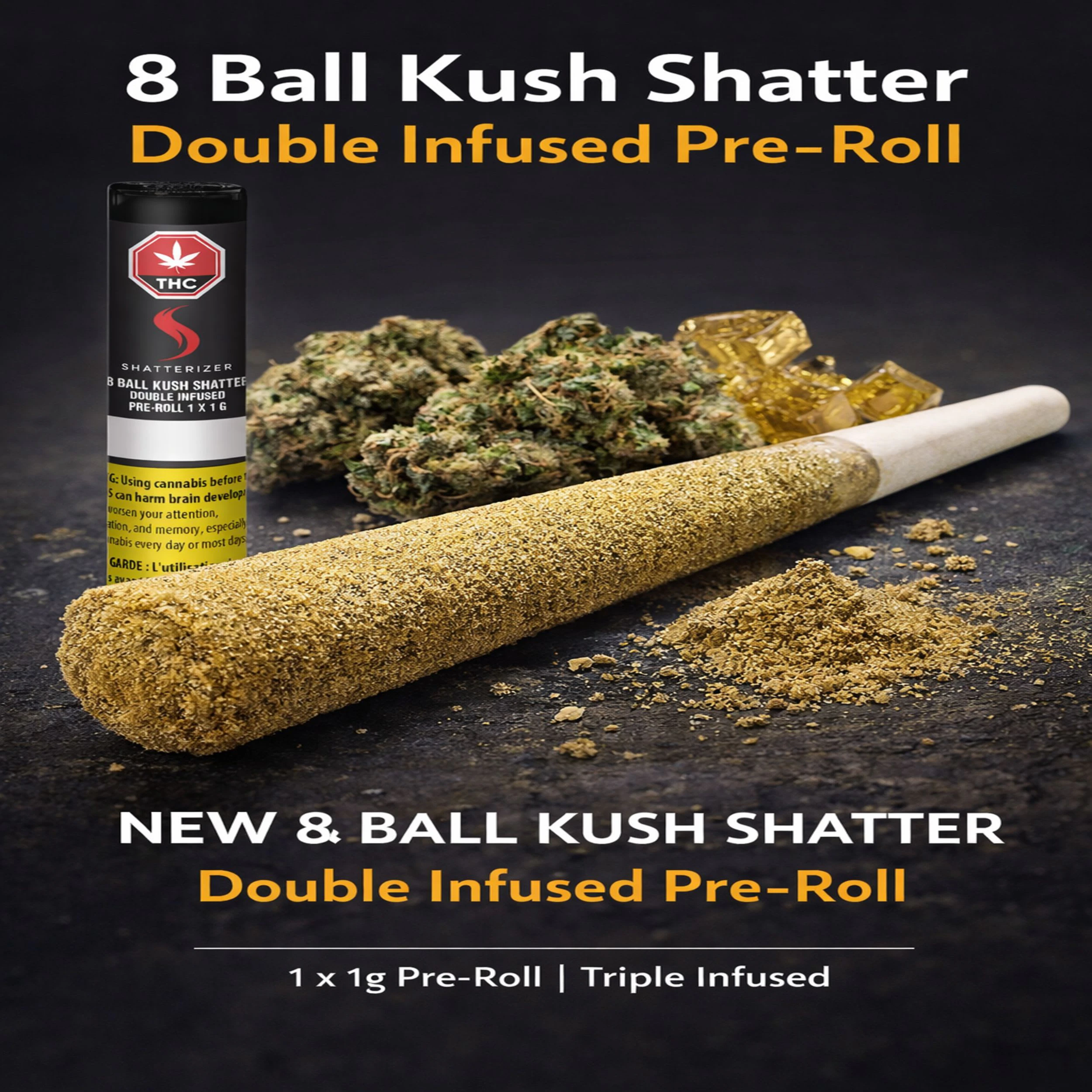 We’re thrilled to roll out new innovation to our shatterizing family: the 8 Ball Kush Shatter Double Infused Pre-Roll. Made with love in Ontario and with 8 Ball Kush flower, infused with 8 Ball Kush Shatter, our Shatterizer Pre-Roll is double the 8 Ball Kush and then double infused and double rolled. This joint is Shatterized, rolled up and then rolled in Kief for double the Kushy Kushy pre-rolled #PerfectClouds. Tripling the trichomes with flower, shatter and kief is a combination you can bank on for the highest quality of flavours and potency. Our 8 Ball Kush Indica, grown from King Kush and Bubba Kush, is an herbaceous garden of terpenes, that will sink into your mouth and call the shots! Using the highest levels of science, tech and quality extraction methods and fresh cannabis inputs selected from the finest in Canada, we are pleased to welcome our NEW 8 Ball Kush Shatter Double Infused Pre-Roll to the Shatterizer Family!