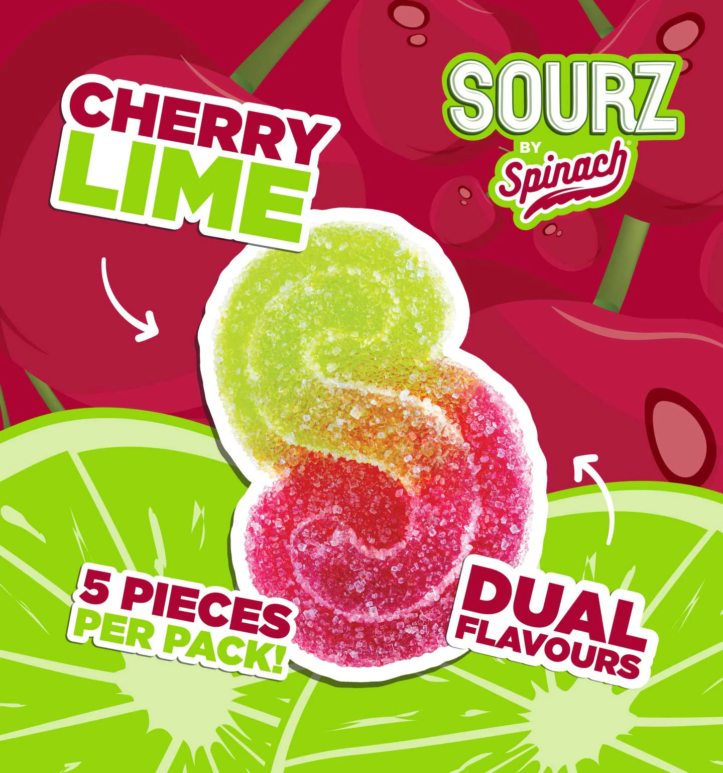 Blast your senses with a mouth-puckering, sour then sweet sensation of Cherry Lime SOURZ by Spinach. This dual-flavoured soft chew blasted with sour crystals is over-the-top with only natural flavours and colours. Enjoy 2 pieces/pack and 10mg THC total.