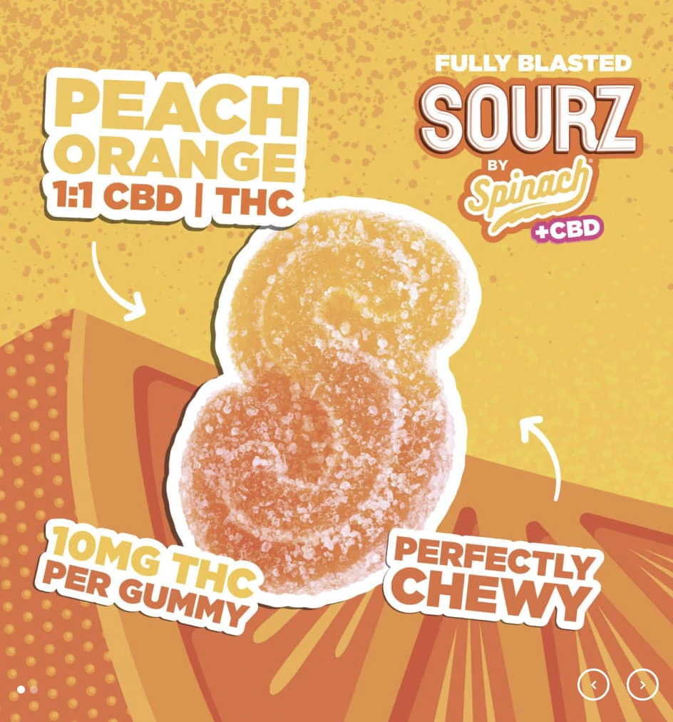 Prepare for blast off! SOURZ by Spinach Fully Blasted Peach Orange 1:1 CBD | THC gummies are action-packed with a balanced blend of 10mg THC and 10mg CBD per piece. Glide through the galaxy with sweet peach and juicy orange flavours! This dual-flavoured gummy is over-the-top with natural flavours and blasted with sour crystals. Enjoy 1 gummy per pack, 10mg THC total and 10mg CBD total.