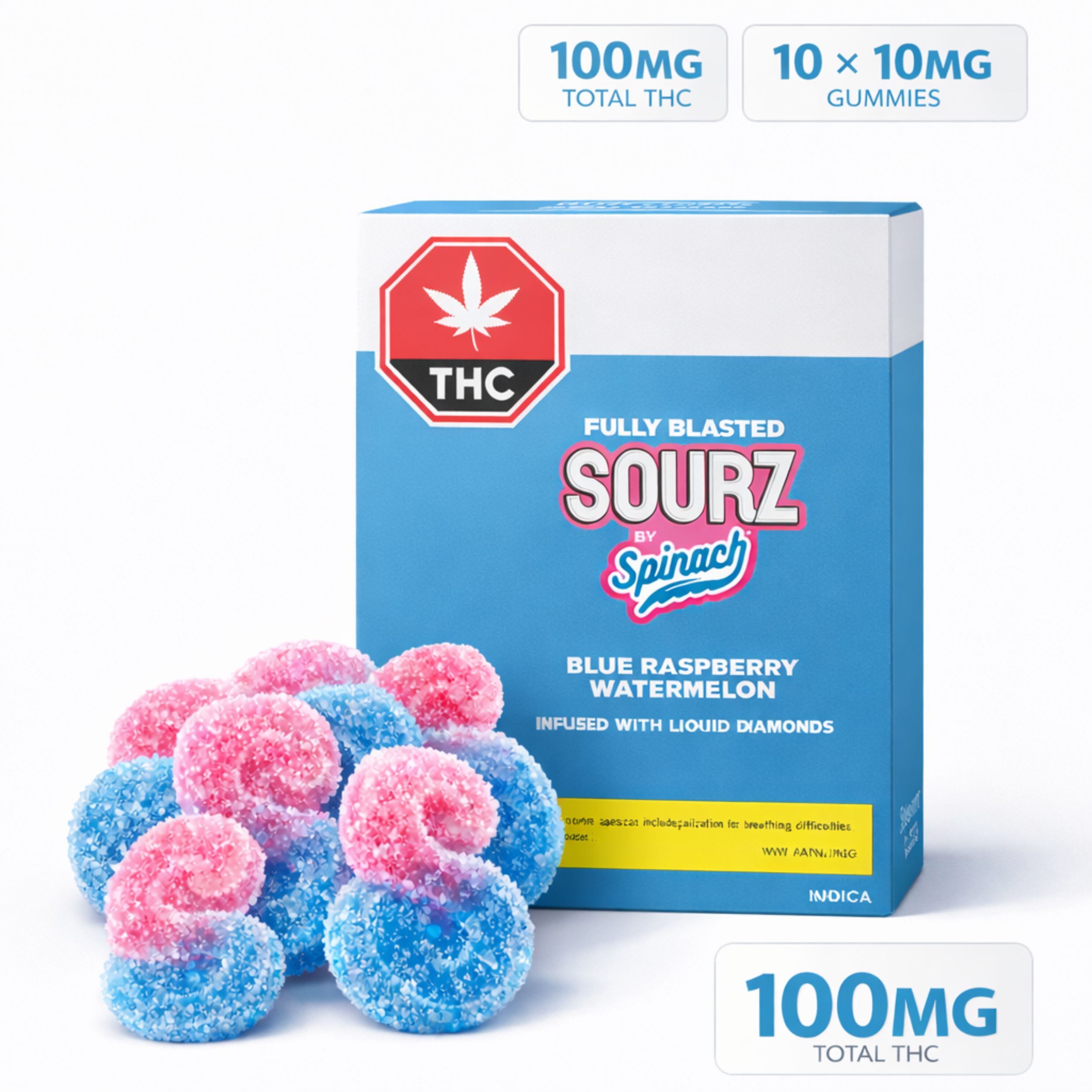 Prepare for blast off! SOURZ by Spinach Fully Blasted Blue Raspberry Watermelon gummies are packed with 10mg THC per piece. With out-of-this-world flavours like electric blue raspberry and fresh watermelon, send your taste buds soaring! These dual-flavoured gummies are over-the-top with natural flavours and blasted with sour crystals. Enjoy 10 gummies with 10mg THC per gummy and 100mg THC total per pack.